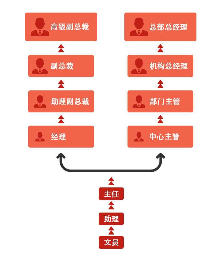 • 公司為員工在公司的成長與發(fā)展設(shè)計了專業(yè)職級和行政管理兩個序列,其中專業(yè)序列涵蓋14個職級,行政序列涵蓋8個職級。員工可以根據(jù)自身優(yōu)勢和意愿選擇職業(yè)發(fā)展道路,通過營造績效輔導(dǎo)的文化,總分公司人力資源部門與各層級主管將幫助員工在職業(yè)發(fā)展中提升崗位需要的專業(yè)及管理能力。另外,通過總分和機構(gòu)之間的輪崗計劃, 提升并拓展了員工的專業(yè)能力和發(fā)展空間。