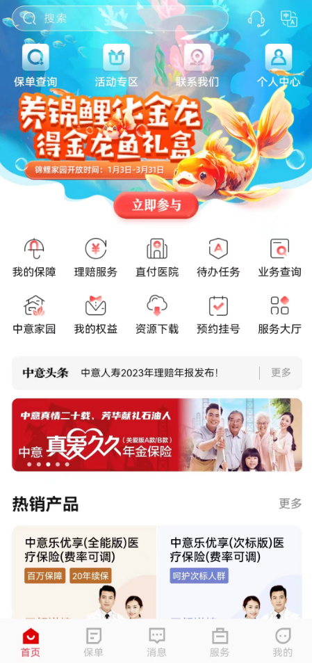 登錄掌上中意,在首頁下方點擊服務