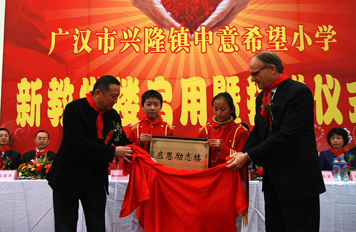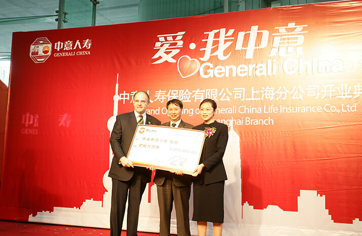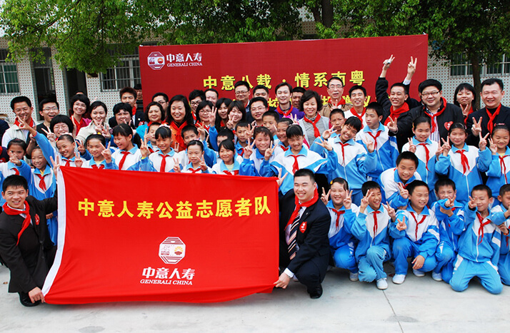 2008年"5.12大地震"發生后僅兩日,中意人壽即決定以公司名義向中國紅十字會捐款30萬元,幫助災區同胞度過難關。此外,中意人壽員工也積極響應,紛紛慷慨解囊,向中國紅十字會捐款21萬余元。后中意人壽又以公司名義捐款50萬元,通過四川省青少年發展基金會于2009年在四川省廣漢市興隆鎮建設"中意希望小學",幫助四川地震災區的孩子們重返校園。