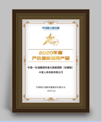 近日,在由中國銀行保險報主辦的“嚴選•厚愛”2020年度保險產品評選活動中,中意人壽保險有限公司(以下簡稱中意人壽)的“一生福康”重疾產品將頗具分量的“2020年度嚴選重疾保險產品”獎項收入囊中。