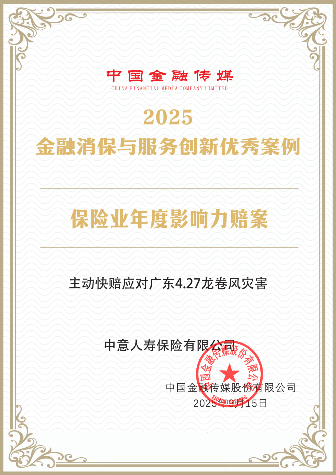 近日,由《中國(guó)銀行保險(xiǎn)報(bào)》主辦的2025年金融消保與服務(wù)創(chuàng)新優(yōu)秀案例評(píng)選結(jié)果對(duì)外公布,中意人壽保險(xiǎn)有限公司(以下簡(jiǎn)稱“中意人壽”)兩項(xiàng)案例獲獎(jiǎng)。其中,《著力構(gòu)建“大消保”體系,用全流程管控織密消費(fèi)者權(quán)益防護(hù)網(wǎng)》榮獲“金融消保機(jī)制創(chuàng)新優(yōu)秀案例”,《主動(dòng)快賠應(yīng)對(duì)廣東4.27龍卷風(fēng)災(zāi)害》榮獲“保險(xiǎn)業(yè)年度影響力賠案”。本次獲獎(jiǎng),體現(xiàn)出中意人壽始終堅(jiān)持“金融為民”的價(jià)值取向,彰顯出其在消費(fèi)者權(quán)益保護(hù)與理賠服務(wù)方面的不懈努力及優(yōu)秀成果。