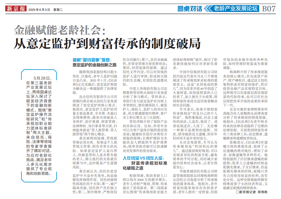 5月28日,在第三屆老齡產業發展論壇上,兩場圓桌論壇深入探討了銀發經濟背景下的金融創新模式。圍繞“意定監護操作流程研究”和“傳承規劃職業能力團體標準研制”兩大主題,來自信托、保險、法律等領域的專家學者展開了精彩對話,為應對老齡化挑戰、滿足老年人多元化需求提供了專業視角和創新思路。