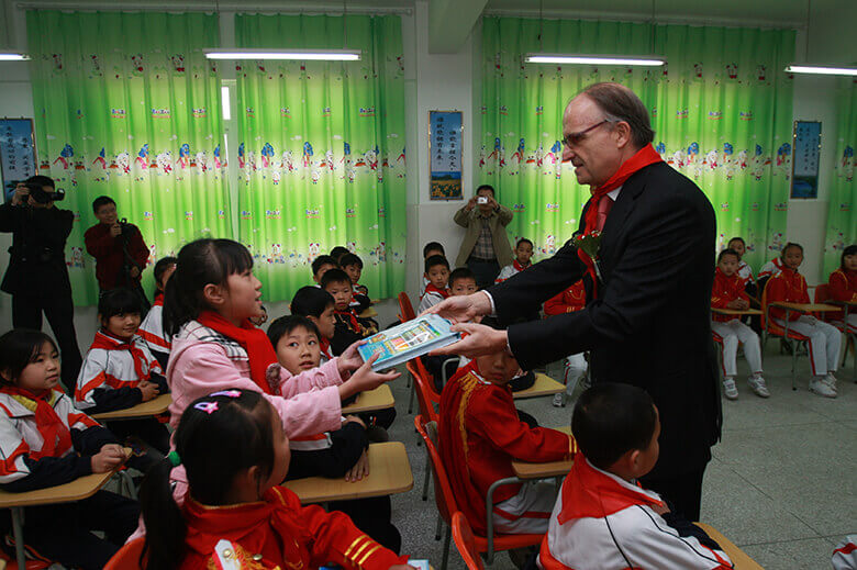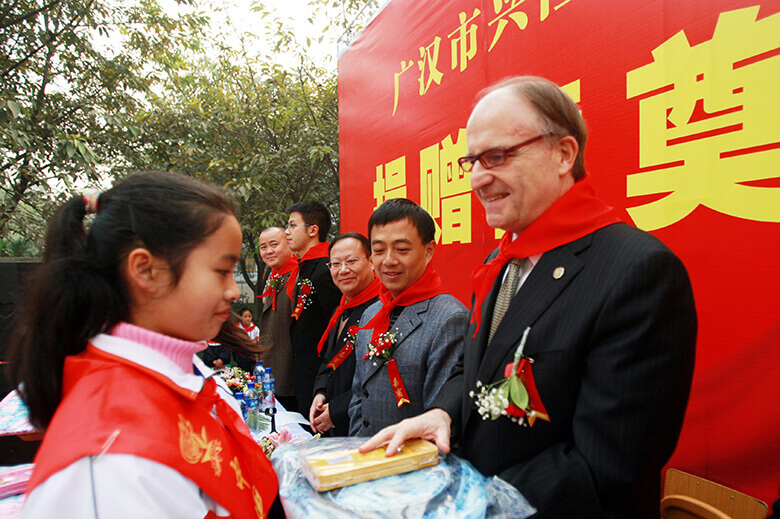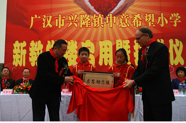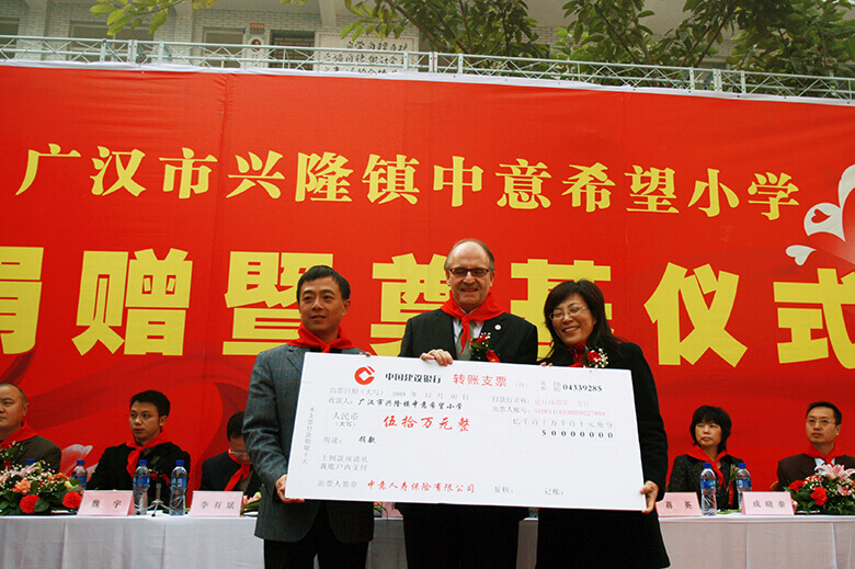 2008年5月12日,8.0級的強(qiáng)烈地震襲擊了四川汶川。消息傳來,中意人壽向受災(zāi)較為嚴(yán)重的四川省廣漢市興隆鎮(zhèn)伸出了援手——捐助50萬元用于興隆鎮(zhèn)中心小學(xué)的重建,重建后的小學(xué)將更名為廣漢市興隆鎮(zhèn)“中意希望小學(xué)”。2009年12月2日,“中意希望小學(xué)”捐贈暨奠基儀式隆重舉行。時任中意人壽總經(jīng)理易思樂代表公司向小學(xué)捐贈了善款及200套嶄新的書包和文具。2010年,重新修建的教學(xué)樓在校園內(nèi)矗立起來,它高達(dá)4層,建筑面積2200平方米,可容納700余名學(xué)生就讀,并設(shè)有多媒體教室等先進(jìn)教學(xué)設(shè)施,極大地改善學(xué)校的基礎(chǔ)教育條件。2010年11月18日, “中意希望小學(xué)”新教學(xué)樓啟用暨捐贈儀式隆重舉行。在啟用儀式現(xiàn)場,中意人壽還向希望小學(xué)捐贈了電腦等一批教學(xué)設(shè)備和籃球、乒乓球拍、羽毛球拍、棋類等體育用品。