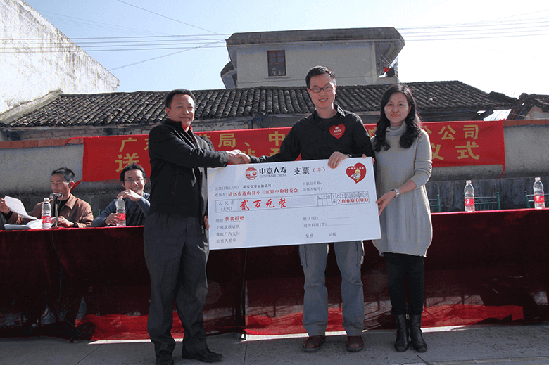 廣東省清遠(yuǎn)市連山縣小三江鎮(zhèn)中和村是廣東保監(jiān)局聯(lián)手廣東保險業(yè)對口幫扶的廣東最貧困的村莊之一。2010年12月,中意人壽愛心公益基金向中和村委會捐贈兩萬元現(xiàn)金,并向村民們贈送了嶄新的棉被共126床。一年后,中意人壽愛心公益基金向中和村小學(xué)健康安全用水改建工程捐助一萬三千余元,并向該村50戶殘疾人家庭贈送暖水壺。兩次活動捐贈總金額約7萬元。