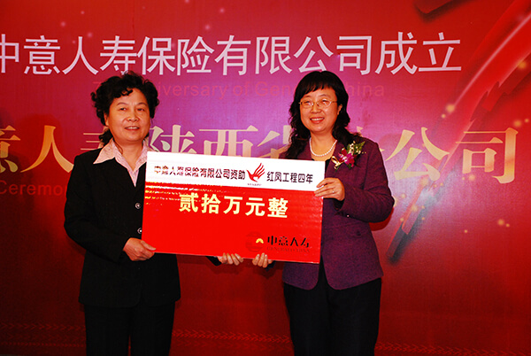 2009年2月,中意人壽向陜西婦聯(lián)“紅鳳工程”捐款20萬元,資助貧困女大學(xué)生完成學(xué)業(yè)。并于同年4月和10月分別舉辦了“中意人壽·紅鳳工程 資助生見面會”和“中意人壽2009紅鳳生金秋見面會”。受資助女大學(xué)生與中意人壽員工的每一次見面,都在真誠的歡笑和感動的淚水中結(jié)束,大家一起續(xù)寫著彼此濃濃的情意。